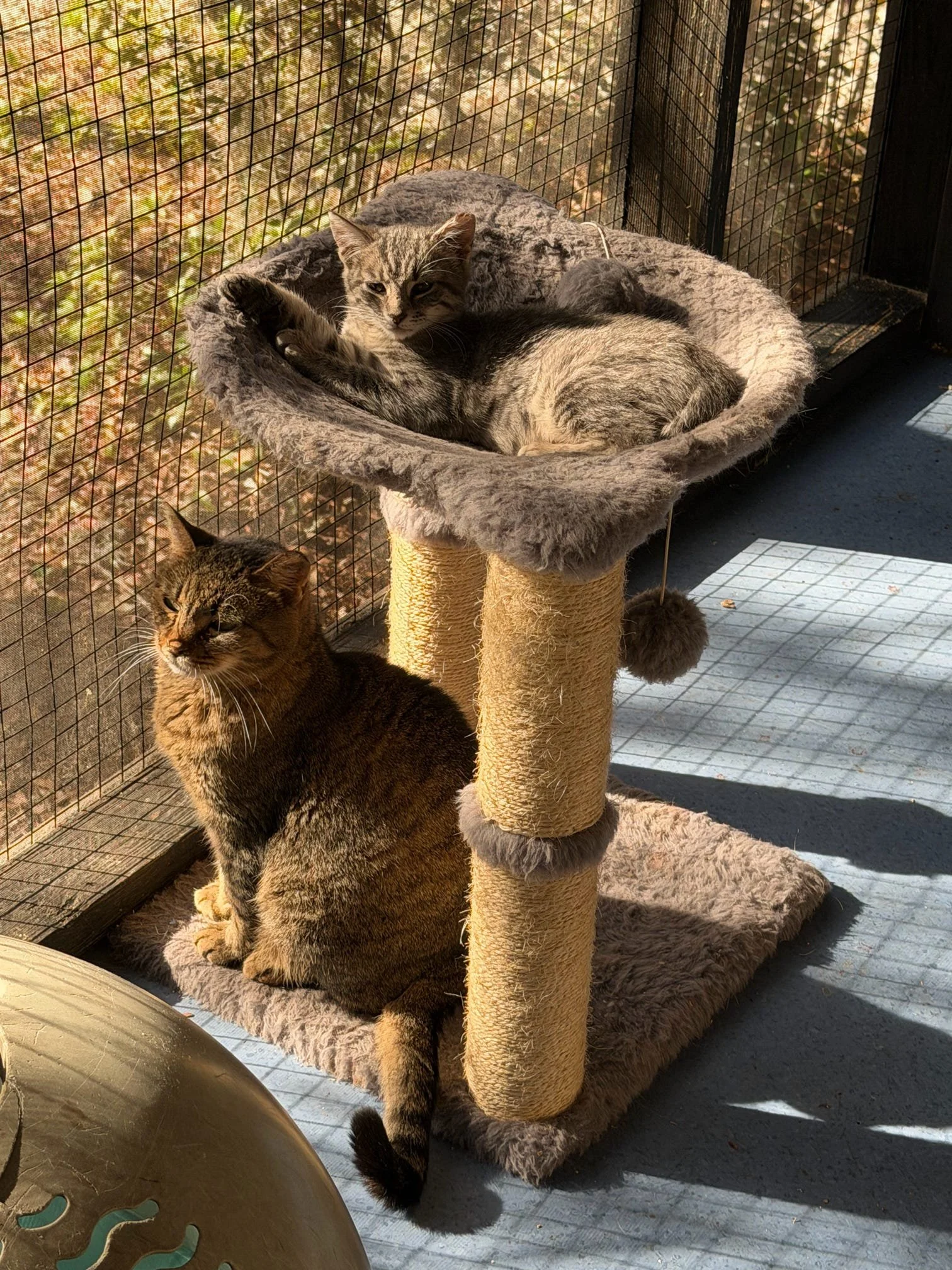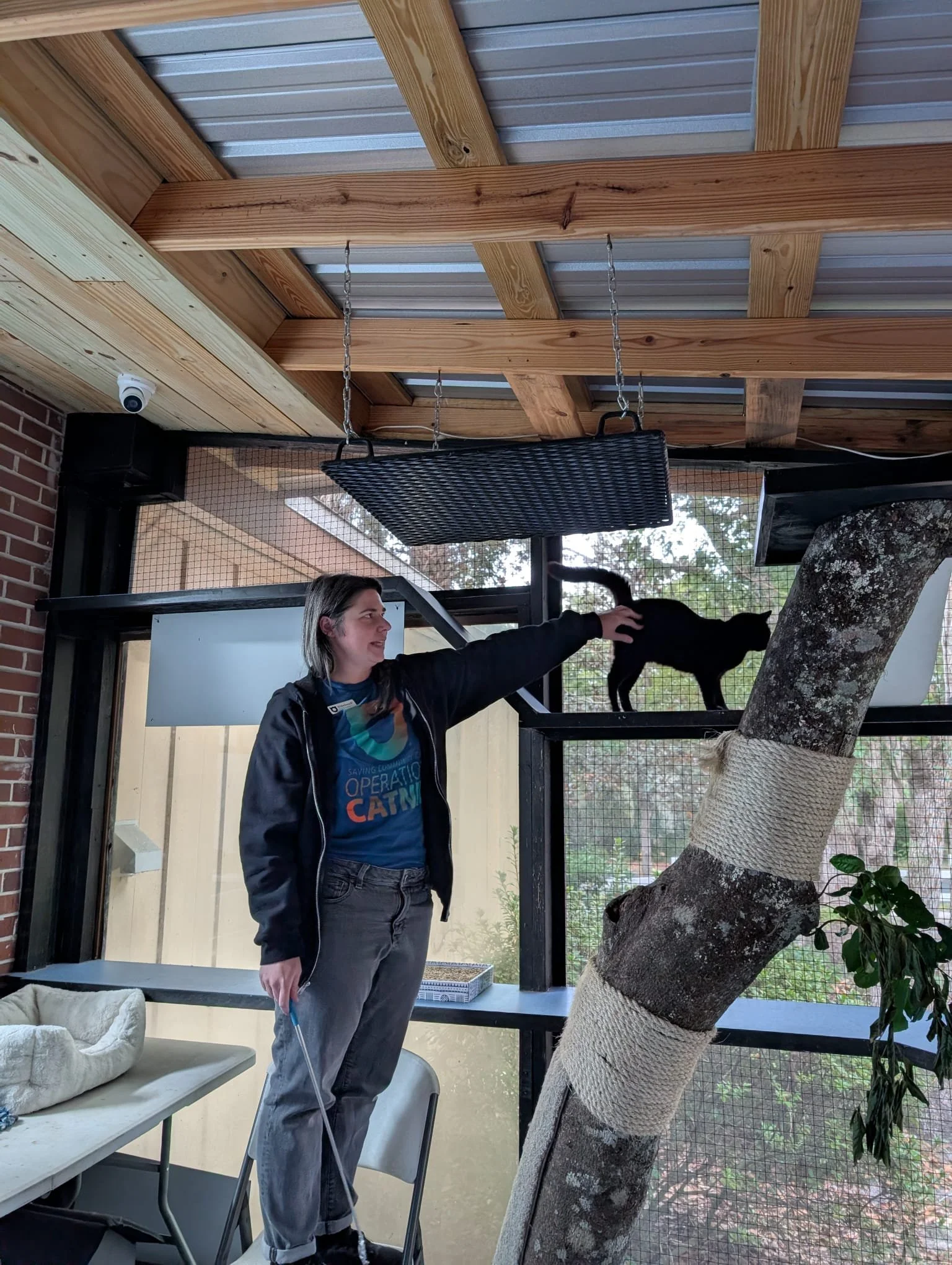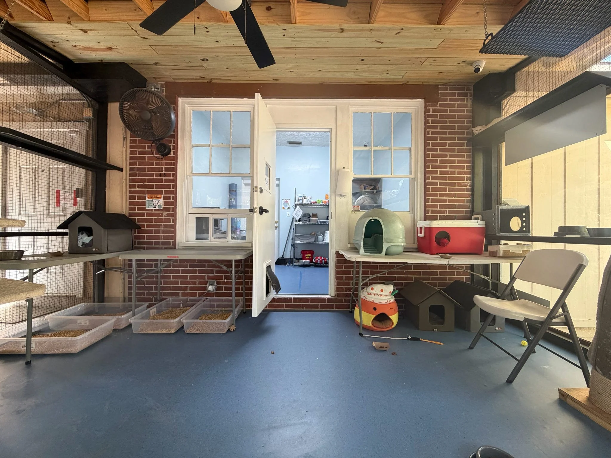Our cats are housed on-site in an indoor-outdoor Catio. This provides them with safe access to outdoor stimuli, where they are also protected from the elements. The space is filled with multiple levels, shelving, platforms, hiding boxes, and climbing posts. Here, the cats decompress and await placement as Working Cats. Those that came without a partner make friends and our team notes their preferences. Volunteers tend to the cats daily, keeping their space clean and their food and water fully stocked. We provide enrichment such as treats, toys made from recycled materials, and fresh cat grass. Medical rounds with the veterinarian are completed each week, but the cats are also assessed daily for health and well-being.